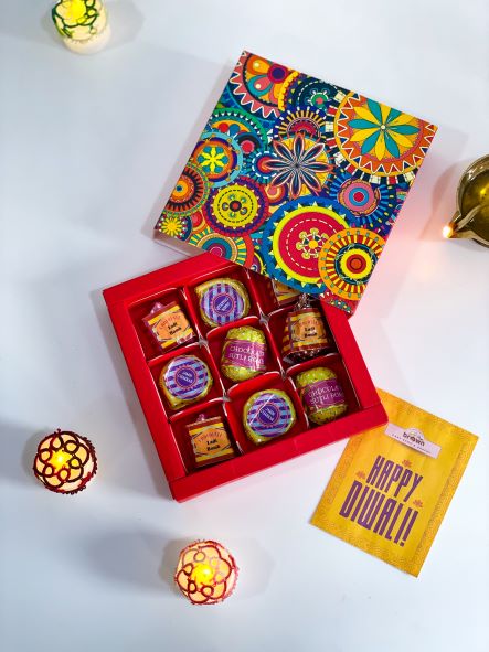 Motichoor is traditional to all Indian festivities and this time, we've made it even more special by including it in a cake! - 0.5 kg and A 9 piece dry fruit chocolate box that is sure to bring joy to your Diwali celebrations